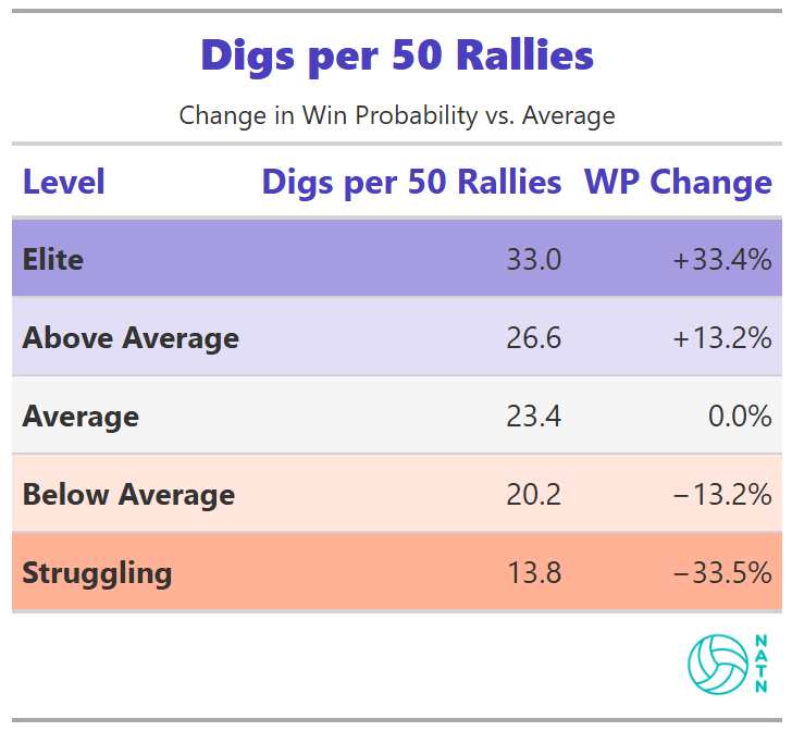 Low dig volume often means the opposite: getting aced, getting blocked, or watching opponents terminate on first contact. The table doesn’t explain why volume matters. It just shows that it does.