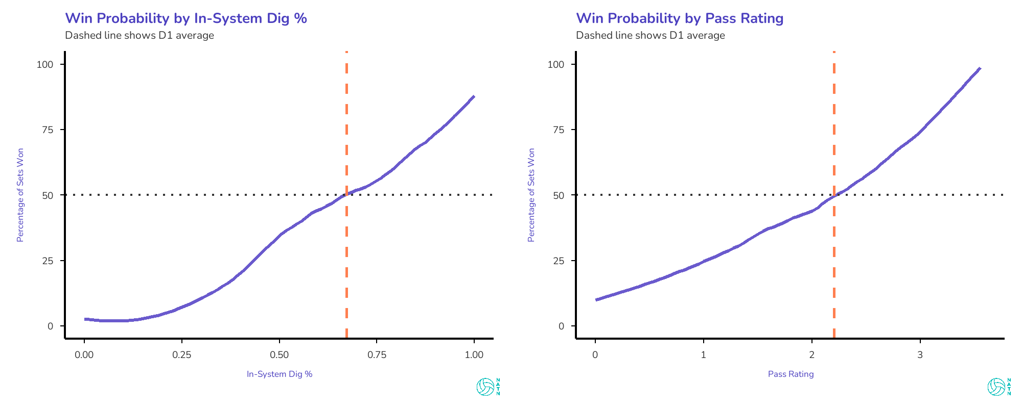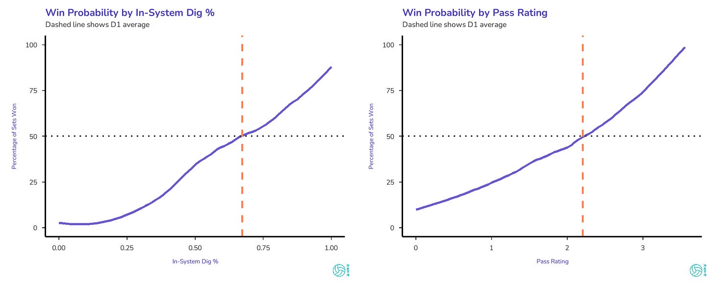 Both curves trend upward. Better in-system dig percentage, higher win probability. Better pass rating, higher win probability. But the slopes are different. The in-system dig curve is steeper, more linear, more relentless. Every improvement buys real gains, and those gains don’t plateau. The pass rating curve is gentler—it matters, but not as dramatically.