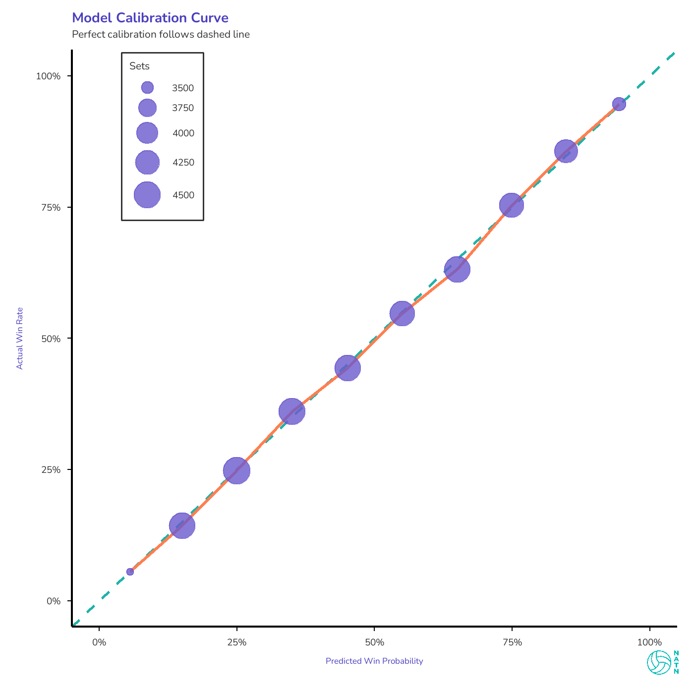When the model assigns a probability to a set outcome, that number has to mean something. A team given a 70% chance to win should win roughly seven sets out of ten. A team with a 25% chance should win about one in four. If those relationships don’t hold, the output isn’t insight—it’s decoration.