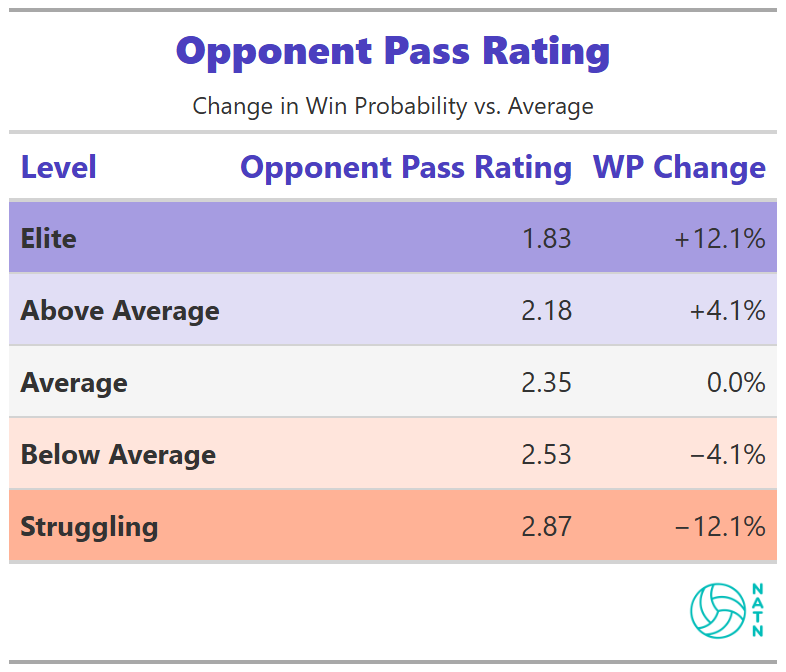 That makes sense. Your opponent’s pass rating only matters if you can capitalize on it. If they pass poorly but you can’t transition into quality offense—because your block isn’t creating opportunities or your defense can’t stay in system—you’ve wasted the leverage.