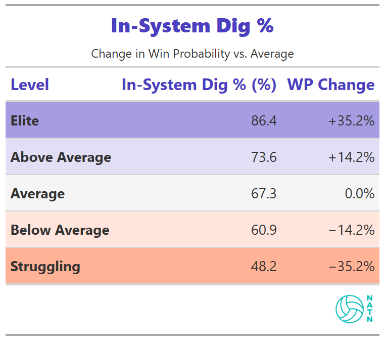 Here’s what that looks like in practice. Say you’re below average in in-system dig percentage. The tables tell you roughly what that’s costing in terms of win probability. Now you can ask better questions. What would it take to move to average? Is that realistic given who’s on the roster? If we can’t improve there, where else can we make gains that offset it? What would we have to sacrifice—practice time, personnel decisions, strategic emphasis—to get there?