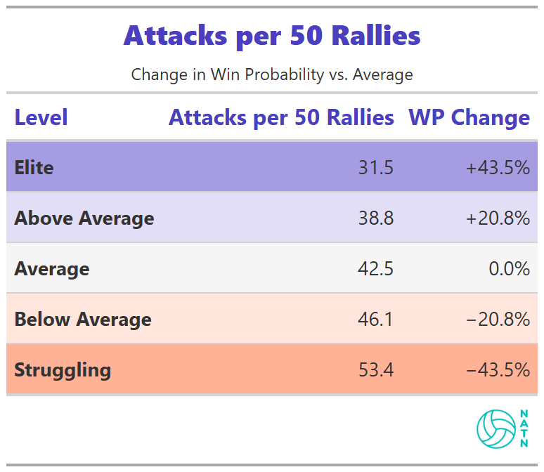 Elite teams, on average, take fewer attacks per 50 rallies than struggling ones. The gap in win probability between those extremes is significant.