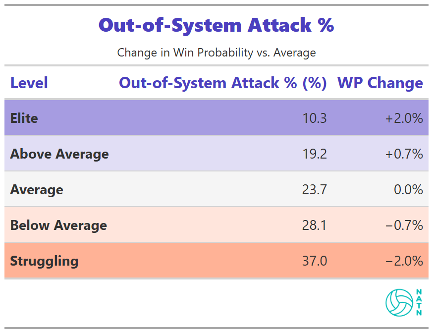 Out-of-system attack percentage shows a weaker, flatter relationship than most coaches would expect.